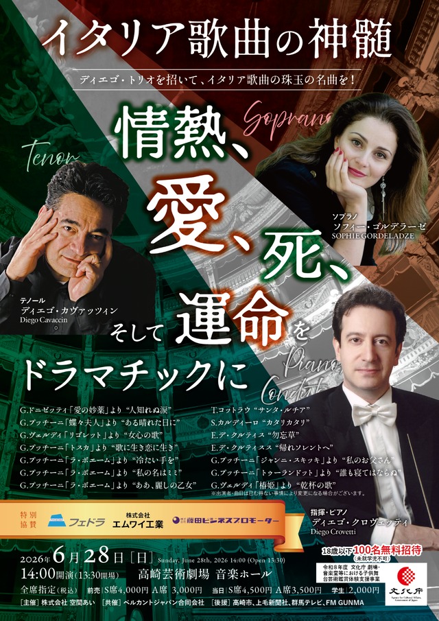 イタリア歌曲のすべて~情熱、愛、死、そして運命をドラマチックに 令和8年度、文化庁劇場・音楽堂等における子供舞台芸術鑑賞体験支援事業採択 18歳以下の方をご招待をいたします。(未就学児不可) チケット送付代として110円をいただきます。 ホームページ:https://kuukanai.com/ チケット購入:https://shop.kuukanai.com/ 2026年6月28日(日)14:00開演(13:30開場) 高崎芸術劇場 音楽ホール 【出演】 ディエゴ・トリオ ディエゴ・クロヴェッティ(指揮・ピアノ) ソフィー・ゴルデラーゼ(ソプラノ) ディエゴ・カヴァッツィン(テノール) 【曲目】 G.ドニゼッティ/「愛の妙薬」:"人知れぬ涙" G.プッチーニ/「蝶々夫人」:"ある晴れた日に" G.ヴェルディ/「リゴレット」:"女心の歌" G.プッチーニ/「トスカ」:"歌に生き恋に生き" G.プッチーニ/「ラ・ボエーム」:"冷たい手を"、"私の名はミミ"、"ああ、麗しの乙女" T.コットラウ/"サンタ・ルチア" S.カルディーロ/"カタリカタリ" E.デ・クルティス/"勿忘草"、"帰れソレントへ" G.プッチーニ/「ジャンニ・スキッキ」:"私のお父さん" G.プッチーニ/「トゥーランドット」:"誰も寝てはならぬ" G.ヴェルディ/「椿姫」:"乾杯の歌" 【料金(税込)】 全席指定 S席 4,000円(当日4,500円) A席 3,000円(当日3,500円) 学生 2,000円(S席 証明書要) ミラノからディエゴトリオを迎えて イタリアオペラの名曲は、伝統的な舞台を超え、スポーツや現代社会に新たな感動をもたらしている。選手たちがオペラ楽曲を用いることで、演技や競技の価値が高まり、観客もより深い感動を味わうことができる。誰もが、一度耳にしたことがある、プッチーニ作曲のオペラ『トゥーランドット』のアリア「誰も寝てはならぬ(Nessun Dorma)」は、壮大な旋律と高揚感に満ちた楽曲で、主人公カラフが勝利を確信し、希望を歌い上げる。このアリアは、力強さと美しさを兼ね備えており、荒川静香が、2006年トリノオリンピックのフリー演技でこの楽曲を選び、華麗なイナバウアーとともに観客を魅了した。彼女の演技は、音楽とスポーツの融合による新たな伝説を生み出し、日本初の女子フィギュア金メダルという偉業を達成している。 あれから20年、『Time To Say Goodbye』はイタリアのテノール歌手アンドレア・ボチェッリと英国のソプラノ歌手サラ・ブライトマンによって広く知られるようになった楽曲で、明るくドラマティックな旋律と、希望や別れを感じさせる歌詞が特徴で、坂本花織はミラノ・コルティナ五輪でこの曲を使用し、力強さと繊細さを兼ね備えた演技を披露した。彼女の滑走は、楽曲の持つ感情の豊かさとスポーツの躍動感を見事に融合させ、観客に深い印象を残した。 プッチーニは、19世紀末から20世紀初頭に活躍したイタリアの作曲家で、情熱的かつドラマティックな作品で知られており、『誰も寝てはならぬ』は、テノール歌手ルチアーノ・パヴァロッティによって世界的に有名になり、アンコールでもよく披露される。 また、『Time To Say Goodbye』はボチェッリの温かみのある声が特徴で、彼のライブやアンコールでも頻繁に歌われ、観客との一体感を生み出している。 イタリアオペラは、感情表現と壮大な音楽性が特徴で、伝統的なオペラは、劇場での生演奏が主流である。今回登場するディエゴトリオは、トリノの中心に演奏活動をひろげており、プッチーニを中心に、イタリアオペラの名曲そして歌曲の珠玉を披露する。情熱、愛、死、そして運命をドラマティックに表現し、今回、高崎芸術劇場にはじめて登場する。現代では、スポーツイベントや映画、テレビでも広く使われ、名曲を舞台で実演芸術として堪能できるまたとない機会で、アリアや名曲は、聴衆の心に訴え、人生のドラマを強調する役割を担い、芸術的価値を示して、私たちに深い感動を与えてくれる。特にイタリアオペラの名曲は、言語や文化の壁を越えて人々の心に響き、勝利や別れ、希望といった普遍的なテーマを象徴的に表現し、演技に込められた心情や物語が音楽と一体となることで、観客はより深い感動や共感を覚え、人生のドラマをともに体験することができる。今回の演奏会で、イタリアオペラの名曲が、皆様に、様々な分野で新たな感動の感じてもらえることを確信しています。 また、オペラ劇場や日本で開催される大会やアイスショーでは、和服で観戦して、雰囲気が華やぎ、海外のアーティストや選手やファンもから喜ばれることが多い。凛とした姿勢、背筋が伸びるために、長時間の鑑賞、観戦でも疲れにくいという。その華やかさを醸し出すために、和服で来場していただける方のみ招待することにした。詳細は、下記までご連絡を 株式会社 空間あい 新井淨