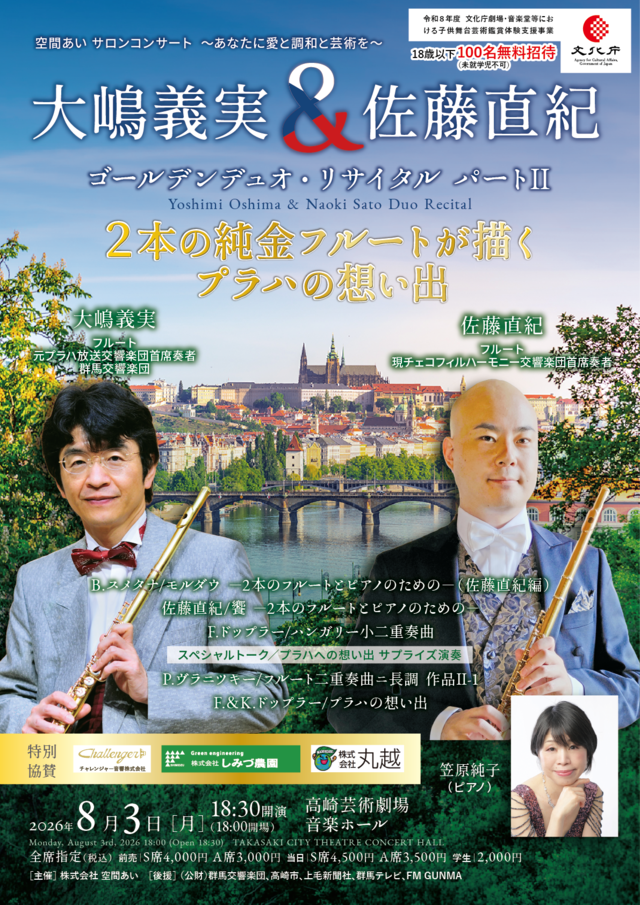 令和8年度、文化庁劇場・音楽堂等における子供舞台芸術鑑賞体験支援事業採択 18歳以下の方をご招待をいたします。(未就学児不可) チケットを郵送で送付しますので、郵送料をいただきます。 ホームページ:https://kuukanai.com/ チケット購入:https://shop.kuukanai.com/ 2026年8月3日(月)18:30開演(18:00開場) 高崎芸術劇場音楽ホール 【出演】 大嶋義実(フルート、元プラハ放送交響楽団首席奏者、群馬交響楽団) 佐藤直紀(フルート、現チェコフィルハーモニー交響楽団首席奏者) 笠原純子(ピアノ) 【曲目】 B.スメタナ/モルダウ-2本のフルートとピアノのための(佐藤直紀編) 佐藤直紀/饗-2本のフルートとピアノのための F.ドップラー/ハンガリー小二重奏曲 スペシャルトーク/プラハへの想い出 サプライズ演奏 P.ヴラニツキー/フルート二重奏曲ニ長調 作品Ⅱ-1 F.&K.ドップラー/プラハの想い出 【料金(税込)】 全席指定 S席 4,000円(当日 4,500円) 大嶋義実、佐藤直紀を迎えて ~プラハの想い出~ 群馬交響楽団は、2020年10月コロナ禍のなか群響名誉指揮者高関健によるスメタナの「わが祖国」全曲を演奏。プレトークで高関は、当時音楽監督として携わった群響欧州公演におけるプラハの春国際音楽祭での思い出などを語った。 群響は1994年、草津町、高崎市の姉妹都市でもあるカルロリヴァリー・ピルゼンを皮切りに、プラハからブタペスト、ブラティスラバ、ウィーンと、ハプスブルグ三都を含む初の海外公演を行った。なかでもプラハにおける「プラハの春国際音楽祭」への登場は、群響にとってはもちろん、同音楽祭にとっても画期的なひと時となった。というのもこの音楽祭は、悲惨な戦争を経験した世界が希求する「平和」のため、音楽の力を信じる人々によって戦後間もなく設立されたからだ。それは取りもなおさず終戦直後に産声を上げた群響の理念と一致する。 1992年打ち合わせのため、私は大嶋の案内でプラハを初めて訪れた。当時プラハの春の音楽祭の委員長をつとめていた作曲家でもあるペトル・エーベン氏とプラハ市民会館内市長ホールで会談するためだ。大嶋は群響入団以前、プラハ放送交響楽団の首席奏者を務め、同地の音楽関係者ときわめて近しい関係を築いていた。その縁をつなぐためにも、平和に対する同じ想いを共有する群響の「プラハの春の国際音楽祭」への招待を氏に願い出た。群響が、同音楽祭と同じ目的によって設立されたことを力説したことが懐かしい。 当時大嶋は、オーケストラ活動の傍らプラハを含め海外のみならず、日本においても積極的にソロ活動も展開していた。そのころ安中市に生まれ、群響の演奏に親しみ、幼稚園時代から母親に連れられ県内で行われる大嶋のほとんどの演奏会に顔を出していたのが、現チェコ・フィル首席フルート奏者佐藤直紀だ。 彼は長じて自らもフルートを吹きたいと、すでに群響を退団し、京都市立芸術大学で教鞭をとるようになっていた大嶋の門をたたく。同大卒業後はハンブルクに留学、ヨーロッパ各地のオーケストラで客演奏者を務めた後、2019年ついにこの座を射止めた。 チェコの首都プラハから帰国した大嶋が群響とプラハの縁をつなぎ、その縁がまたチェコとつながるという国際的サイクルが現実のものとなった。 世界的オーケストラの首席フルート奏者の歩みが群響という土壌から育まれたことを思うとき、それはまさに群馬の示したポテンシャルそのものともいえるのではないか。 今回のデュオ・リサイタルは、二人の歴史的軌跡とインターナショナルな文化が感じられる場であり、日本クラシック音楽界におけるエポックメイキングなコンサートともなろう。群馬交響楽団の音楽的躍動、師弟による芸術的結晶、そして国際舞台への挑戦は、今後も日本音楽界に刺激と希望を与え続けるに違いない。その響きが、聴衆の心へと深く届く瞬間を待つばかりだ。なお両名の愛器が共に純金であることがコンサートタイトルの由来であることを付け加えておく。 (株)空間あい 新井淨 (元群馬交響楽団)