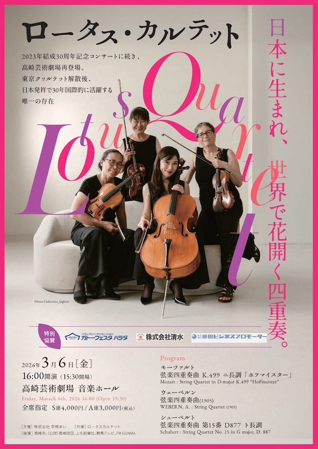 御招待を2枚ご用意させていただき、当日配布プログラムにお名前を記載させていただきます。 日本発、世界が認める四重奏団 — 新生ロータス・カルテット 日本に生まれ、世界で花開く四重奏団、ロータス・カルテットが、2026年を迎えるにあたり新たなステージへと踏み出します。ドイツ・シュトゥットガルトを拠点に、国際的な舞台で活躍を続けてきた彼女たちが、今年から新メンバーを迎え入れます。 2025年よりヴァイオリン奏者として加わるクリスティーネ・ブッシュは、バロック・ヴァイオリンにも造詣が深く、オーケストラのコンサートマスターとしても輝かしいキャリアを持つ音楽家です。彼女を迎えたことで、ロータス・カルテットは「長年の夢が叶った」と語り、情熱的な練習を重ねて新たな音楽の地平を切り拓いています。 2023年には、高崎芸術劇場にてハイドン、メンデルスゾーン、シューベルトの名曲を演奏し、聴衆から高い評価を得ました。その節目を経て、今回はロータス・カルテットが大切にしてきた作曲家たちの弦楽四重奏曲を実演します。 選ばれた3つの作品は、いずれも細やかな感情の揺らぎが光る名曲揃いです。四人で一つの楽器として息を合わせる彼女たちの一体感溢れる演奏を、ぜひホールでご体感ください。 モーツァルト 弦楽四重奏曲 K.499 ニ長調「ホフマイスター」 ウェーベルン 弦楽四重奏曲(1905) シューベルト 弦楽四重奏曲 第15番 D877 ト長調 「四人で一つの楽器」と語るロータス・カルテット。彼女たちの心が響き合う演奏は、聴く者の心に深く染み入ります。新たなメンバーを加え、ますます進化したカルテットの響きを、ぜひ会場でご堪能ください。 ※ ご希望の席の箇所をお伝えください。