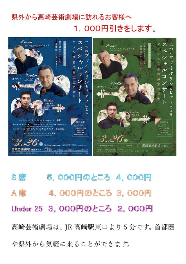 二つのヴァイオリンとピアノによるスペシャルコンサート 県外から来場される方に1000円引きで提供します。 この度、特別な音楽体験をお届けする「二つのヴァイオリンとピアノによるスペシャルコンサート」を開催いたします。本公演では、選りすぐりの演奏家が参画し、魅力的な楽曲を厳選してお届けいたします。 美しい旋律が織りなす二つのヴァイオリンとピアノによるアンサンブルは、聴く人の心に深く響くことでしょう。古典から現代の名曲まで、多彩なレパートリーをお楽しみいただけます。ヴァイオリンの音色とピアノのハーモニーが織りなす、感動的な音楽のひとときをお約束いたします。心の奥に響く音楽で、特別な時間を過ごしてください。 ■開催日時と場所 2025年3月26日(水曜日)18:30開演(18:00開場) :高崎芸術劇場音楽ホール ■チケット情報 全席指定 S席 5,000円 A席 4,000円 Under 25 3,000円ホールの魅力を最大限に楽しむために、ぜひ足をお運びください。 ■出演者 二つのヴァイオリンを担当するのは、実力派の若手演奏家たち。ピアノ伴奏には定評のある名手をお迎えし、素晴らしい演奏から目が離せません。特別な夜のために集まった才能豊かな音楽家たちと共に、皆さまに感動をお届けします。 音楽の力で心を豊かにし、素晴らしい思い出をともに築けることを願っています。この機会に、ぜひ「二つのヴァイオリンとピアノによるスペシャルコンサート」で特別なひとときをお楽しみください。 ※ 全席座席指定のため、ご希望の席をご連絡ください。