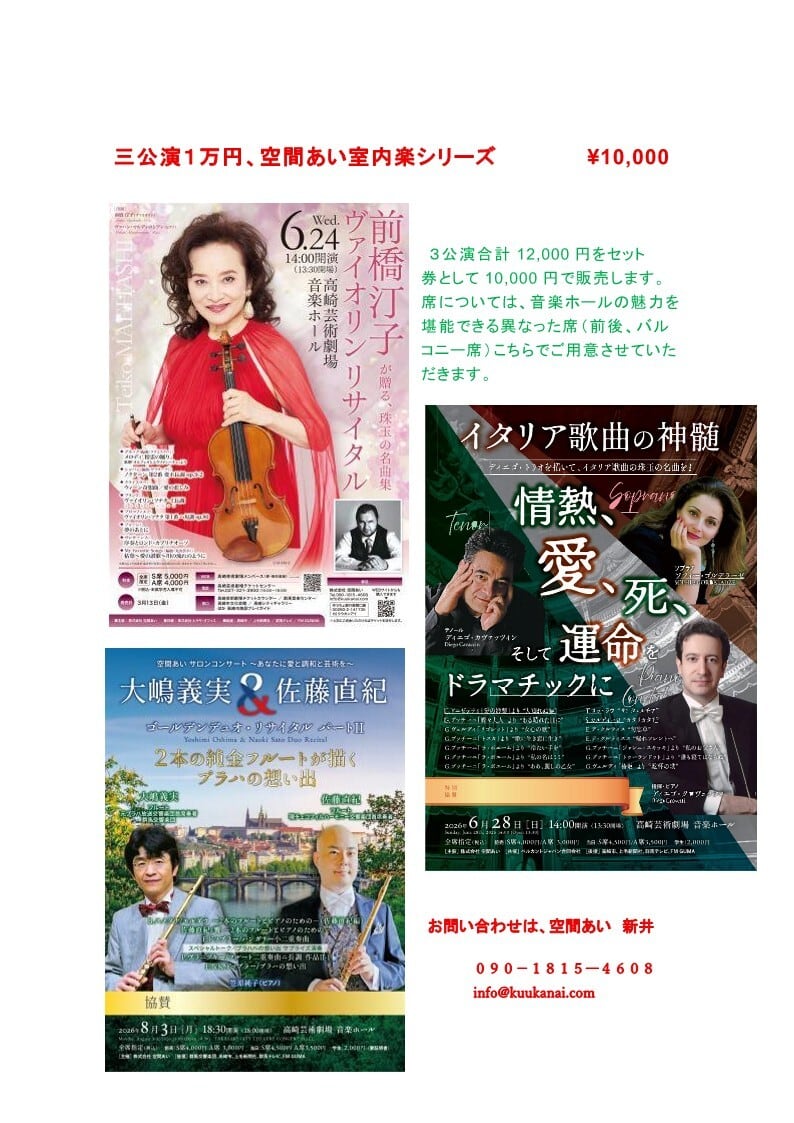 商品名:三公演1万円、空間あい室内楽シリーズ 新しい音楽体験をお届けする、空間あい室内楽シリーズ! 音楽を愛する皆様に贈る特別な三公演をお楽しみいただけます。会場の魅力と共に、さまざまなジャンルの名曲が堪能できる貴重な機会をお見逃しなく! 【公演内容】 1. 国内外で活躍する演奏家たちが奏でる珠玉の名曲 2. 多彩なプログラムで、クラシックから現代音楽まで幅広くご用意! 3. アットホームな雰囲気の中で、心を豊かにする音楽の旅へ この企画は、地元音楽家とのコラボレーションを通じて、音楽の力を再発見し、新たな感動を提供します。心温まる演奏とともに、素敵な時間を共有しましょう。 【料金(税込)】 特別価格の三公演セット券 通常12,000円を、なんと10,000円でご提供! お得で愉しい体験が待っています。 ご予約はお早めに!音楽の楽しみを存分に味わい、感動のひとときをぜひ体験してください。 前橋汀子ヴァイオリンリサイタル ~ヴァハン・マルディロシアン迎えて~珠玉の名曲集~ 2026年6月24日(水)高崎芸術劇場音楽ホール 14:00開演(13:30開場) 【料金(税込)】全席指定 S席 5,000円A席 4,000円 2026年3月13日発売開始 グルック:オペラ「オルフェオとエウリディーチョ」より 第2幕『精霊の踊り』(編曲:クライスラー) ショパン:ノクターン第2番 変ホ長調 op.9-2(編曲:サラサーテ) クライスラー:ウィーン奇想曲、愛の悲しみ フランク:ヴァイオリン・ソナタ イ長調 プロコフィエフ:ヴァイオリン・ソナタ 第1番 ヘ短調 op.80 フォーレ:夢のあとに サンサーンス:序奏とロンド・カプリチオーソ My Favorite Songs:枯葉~愛の讃歌~川の流れのように(編曲:丸山貴幸) イタリア歌曲のすべて~情熱、愛、死、そして運命をドラマチックに 「トゥーランドットより」 イタリアよりディエゴ・トリオを招いて、イタリア歌曲の珠玉の名曲を! ソフィー・ゴルデラーゼ(ソプラノ)ディエゴ・カヴァッツィン(テノール) ディエゴ・クロヴェッティ(ピアノ) 2026年6月28日(日)高崎芸術劇場音楽ホール14:00開演(13:30開場)【料金(税込)】全席指定 S席 4,000円A席 3,000円当日4,500円、3,500円 学生2,000円 2026年3月22日発売開始 ドニゼッティ「愛の妙薬」より、” 人知れぬ涙”. プッチーニ「蝶々夫人」より、”ある晴れた日に”. ヴェルディ「リゴレット」より、”女心の歌” プッチーニ「トスカ」より”歌に生き恋に生き” 「ラ・ボエーム」より”冷たい手を””私の名はミミ””ああ、麗しの乙女” コットラウ ”サンタ・ルチア”、 カルディーロ ”カタリカタリ”、 デ・クルティス ”勿忘草”、 デ・クルティスス ”帰れ、ソレントヘ”. プッチーニ「ジャンニ・スキッキ」より”私のお父さん” 「トゥーランドット」より”誰も寝てはならぬ” G. ヴェルディ「椿姫」より、”乾杯の歌” 群馬が生んだ、現チェコフィル首席佐藤直紀とその師大嶋義実が送る ~大嶋義実&佐藤直紀デュオ・リサイタル~ ~2本の純金フルートが描くプラハの想い出~ 2026年8月3日(月) 18時開場 18時30分開演、指定席 S:4000円 A:3000円 学生:2000円、2026年4月2日発売開始 【出演】 フルート: 大嶋義実(元プラハ放送交響楽団首席奏者、群馬交響楽団) 佐藤直紀(現チェコフィルハーモニー交響楽団首席奏者) ピアノ:笠原純子 【曲目】 B.スメタナ: モルダウ-2本のフルートとピアノのための(佐藤直紀編) 佐藤直紀:饗‐2本のフルートとピアノのための F.ドップラー: ハンガリー小二重奏曲 スペシャルトーク:プラハへの想い出 サプライズ演奏 P.ヴラニツキー: フルート二重奏曲ニ長調 作品Ⅱ‐1 F.&K.ドップラー:プラハの想い出 ※先行発売(4月30日まで) お得なセット券のご案内 上記の3公演合計12,000円をセット券として10,000円で販売します。席については、音楽ホールの魅力を堪能できる異なった席(前後、バルコニー席)こちらでご用意させていただきます。予約は、会場で受付または、下記の事務局へ、メール、電話でお願いします。