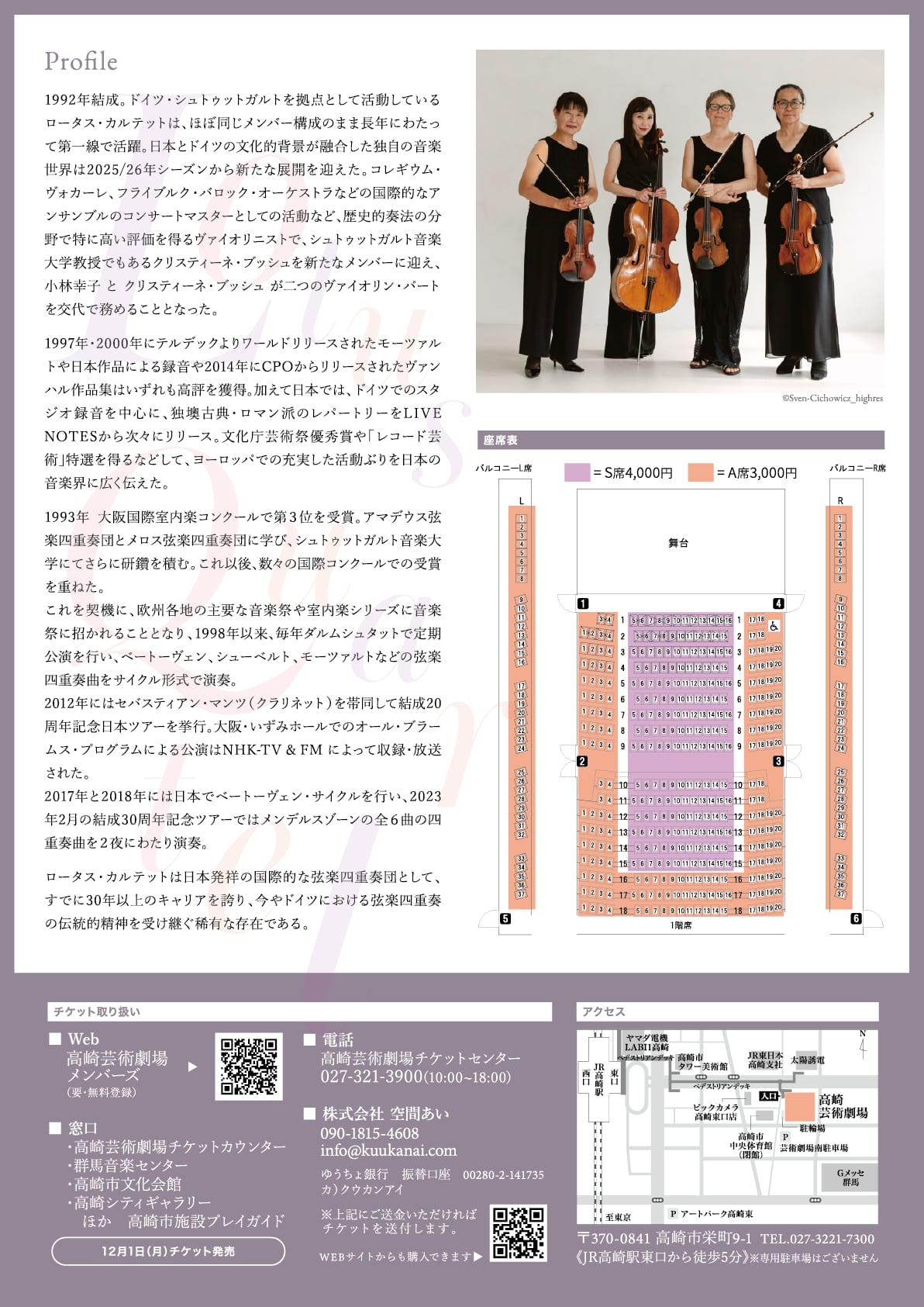 2023年には、高崎芸術劇場にてハイドン、メンデルスゾーン、シューベルトの名曲を演奏し、聴衆から高い評価を得ました。その節目を経て、今回はロータス・カルテットが大切にしてきた作曲家たちの弦楽四重奏曲を実演します。