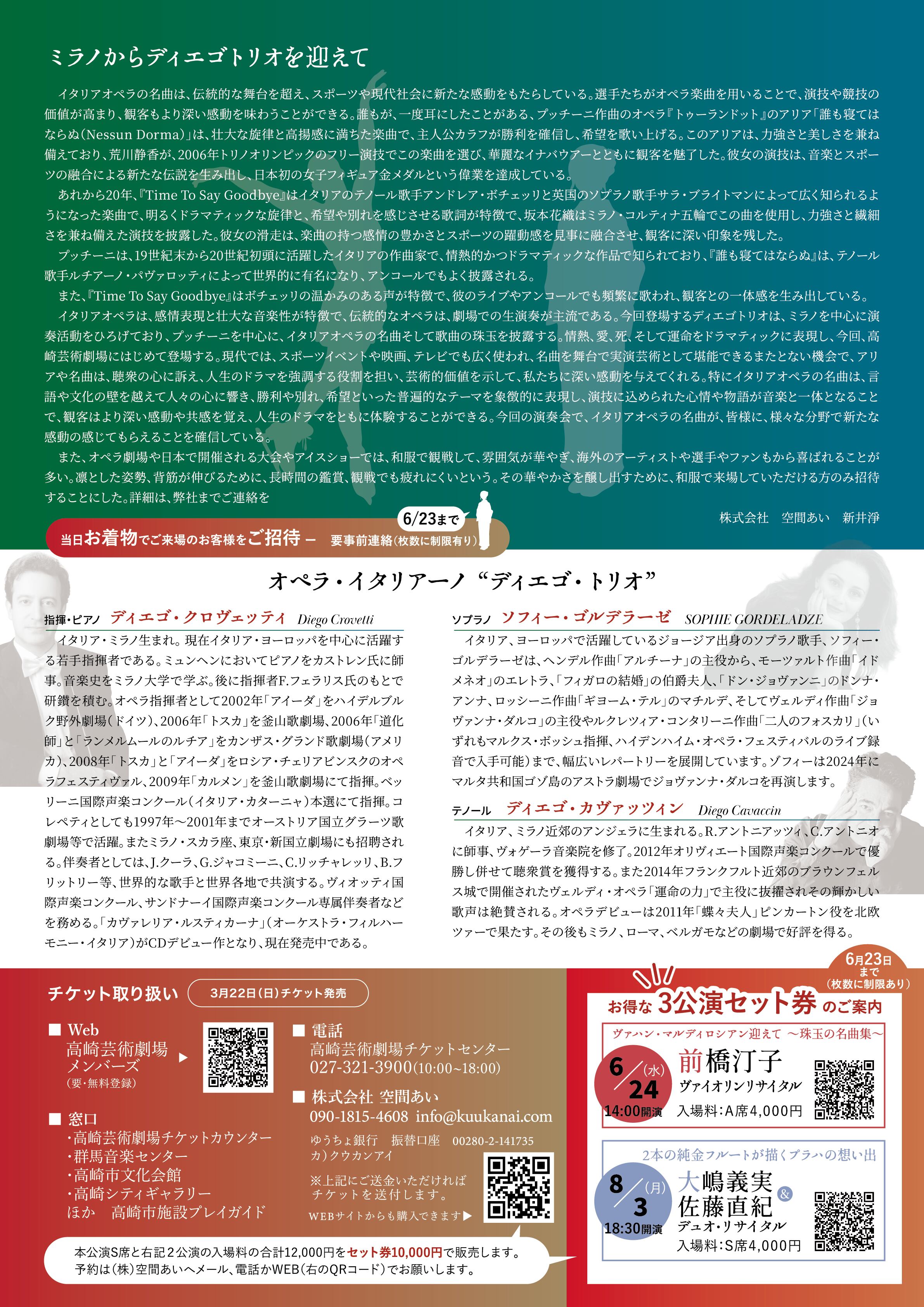 イタリアオペラは、感情表現と壮大な音楽性が特徴で、伝統的なオペラは、劇場での生演奏が主流である。今回登場するディエゴトリオは、トリノの中心に演奏活動をひろげており、プッチーニを中心に、イタリアオペラの名曲そして歌曲の珠玉を披露する。情熱、愛、死、そして運命をドラマティックに表現し、今回、高崎芸術劇場にはじめて登場する。現代では、スポーツイベントや映画、テレビでも広く使われ、名曲を舞台で実演芸術として堪能できるまたとない機会で、アリアや名曲は、聴衆の心に訴え、人生のドラマを強調する役割を担い、芸術的価値を示して、私たちに深い感動を与えてくれる。特にイタリアオペラの名曲は、言語や文化の壁を越えて人々の心に響き、勝利や別れ、希望といった普遍的なテーマを象徴的に表現し、演技に込められた心情や物語が音楽と一体となることで、観客はより深い感動や共感を覚え、人生のドラマをともに体験することができる。今回の演奏会で、イタリアオペラの名曲が、皆様に、様々な分野で新たな感動の感じてもらえることを確信しています。