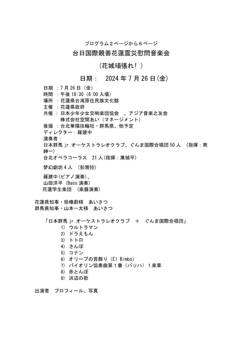 2ページからは、今回台湾花蓮県知事・徐榛蔚様、そして群馬県知事・山本一太様のご挨拶をお願いしております。 その後プログラム、出演者の写真、プロフィール等を掲載いたします。